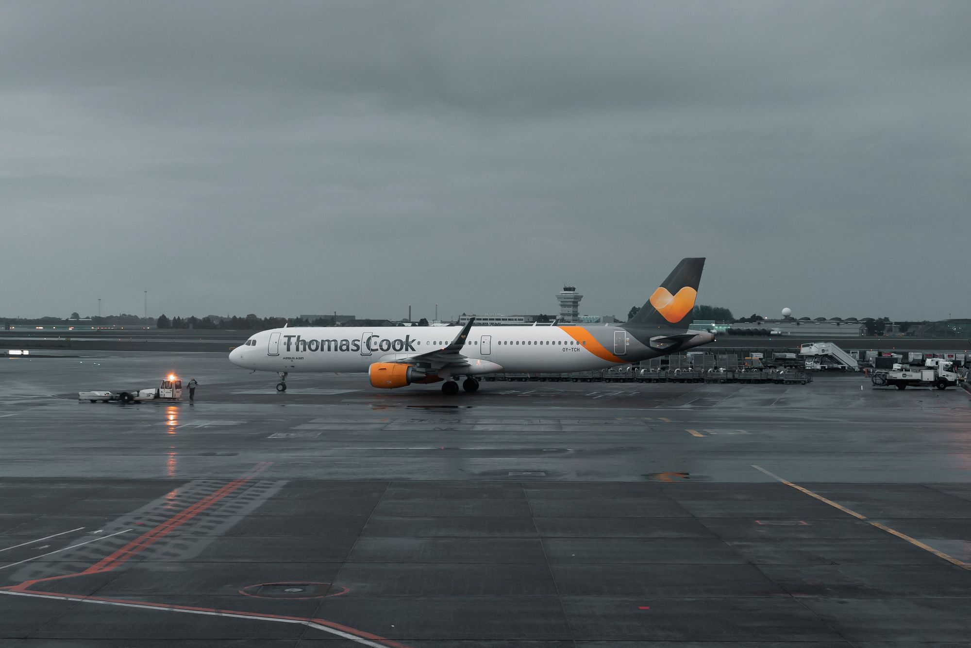 雨逐渐停了,云依然厚。不过哥本哈根机场有Thomas Cook的班机(后来查了一下好像是个旅游公司?),Logo是个爱心,为阴天增加了一抹亮色。借着飞机尾翼比个心。