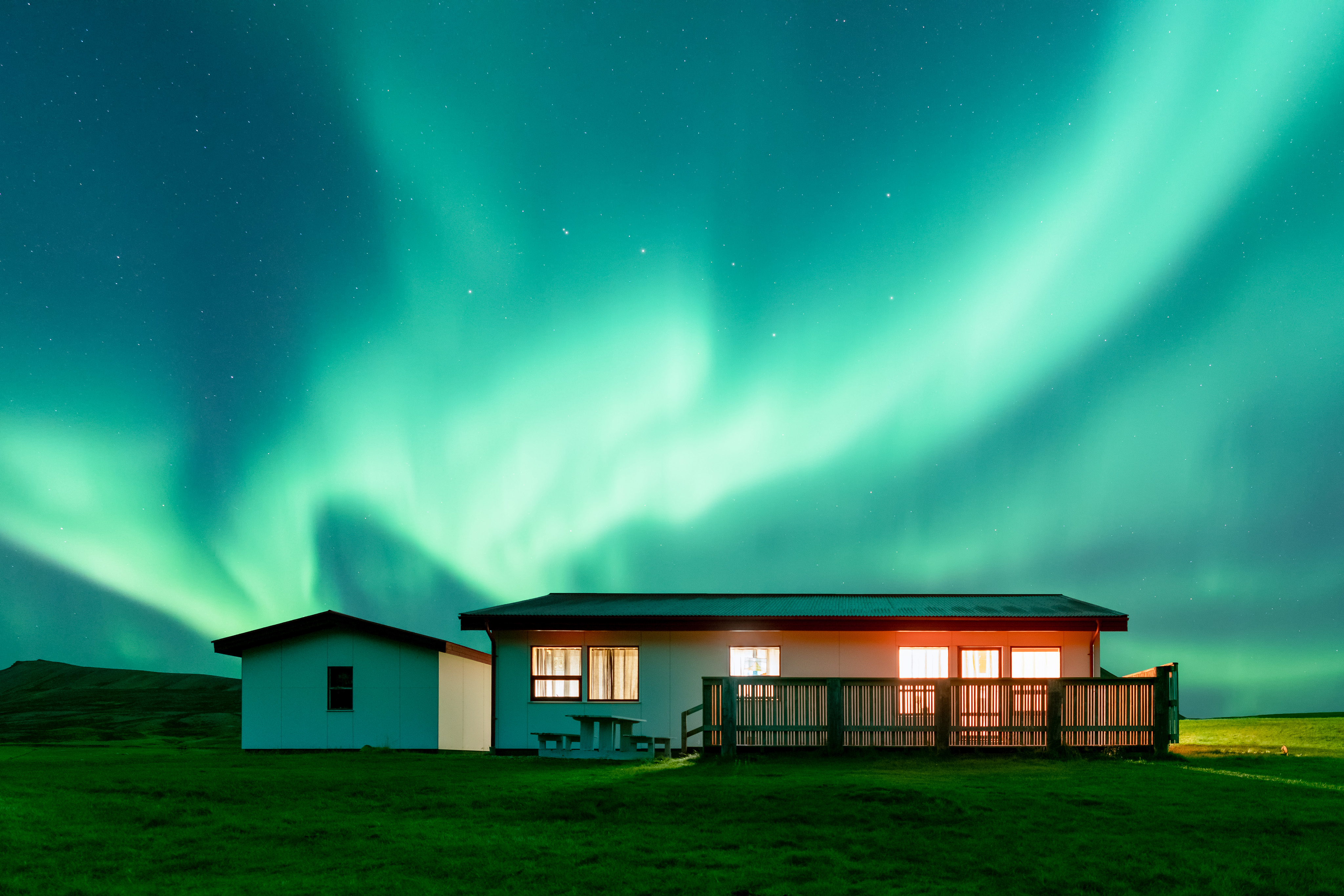外面是大自然的奇观,里面是小屋温馨的灯光,真是梦幻之地。