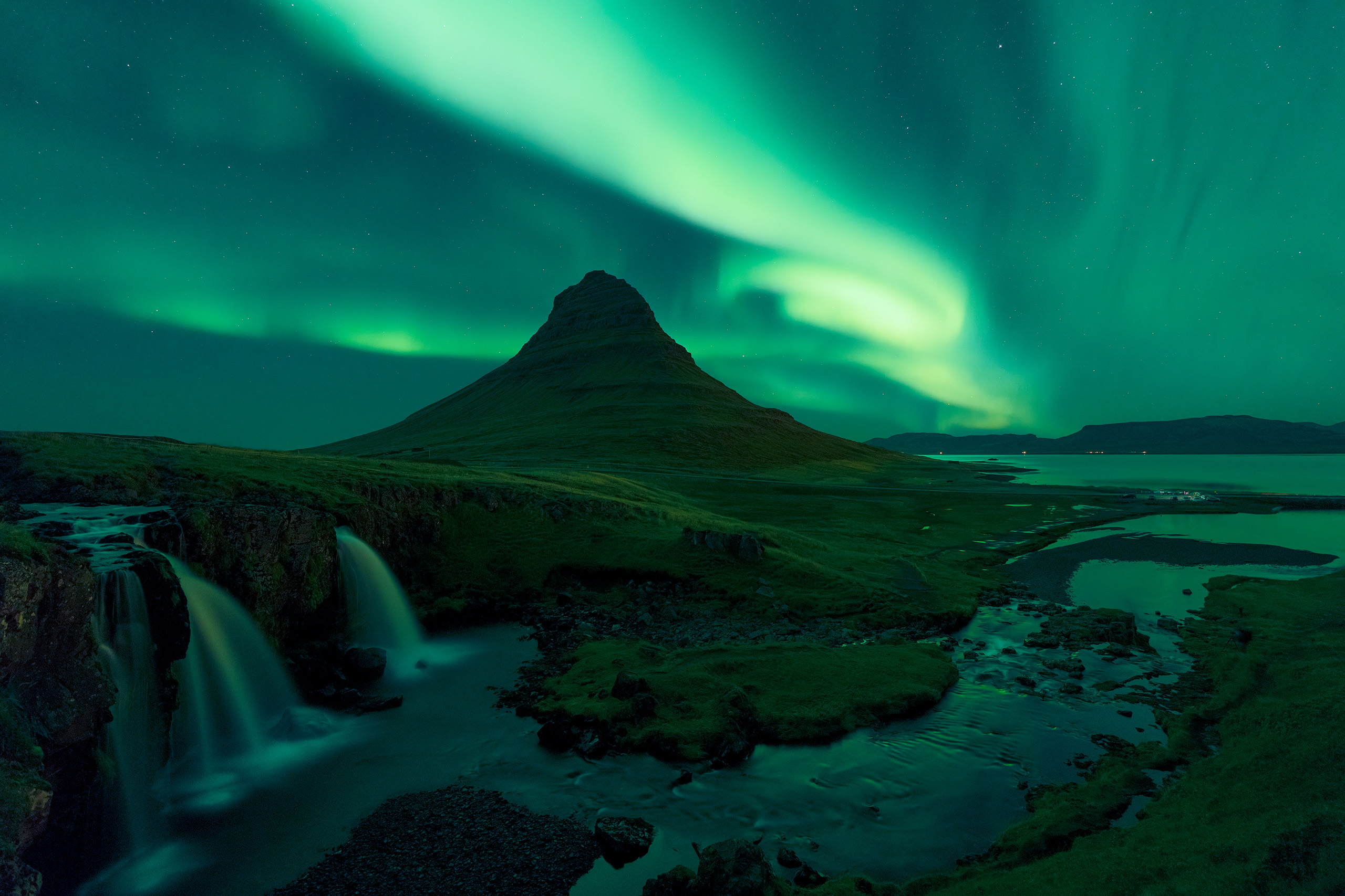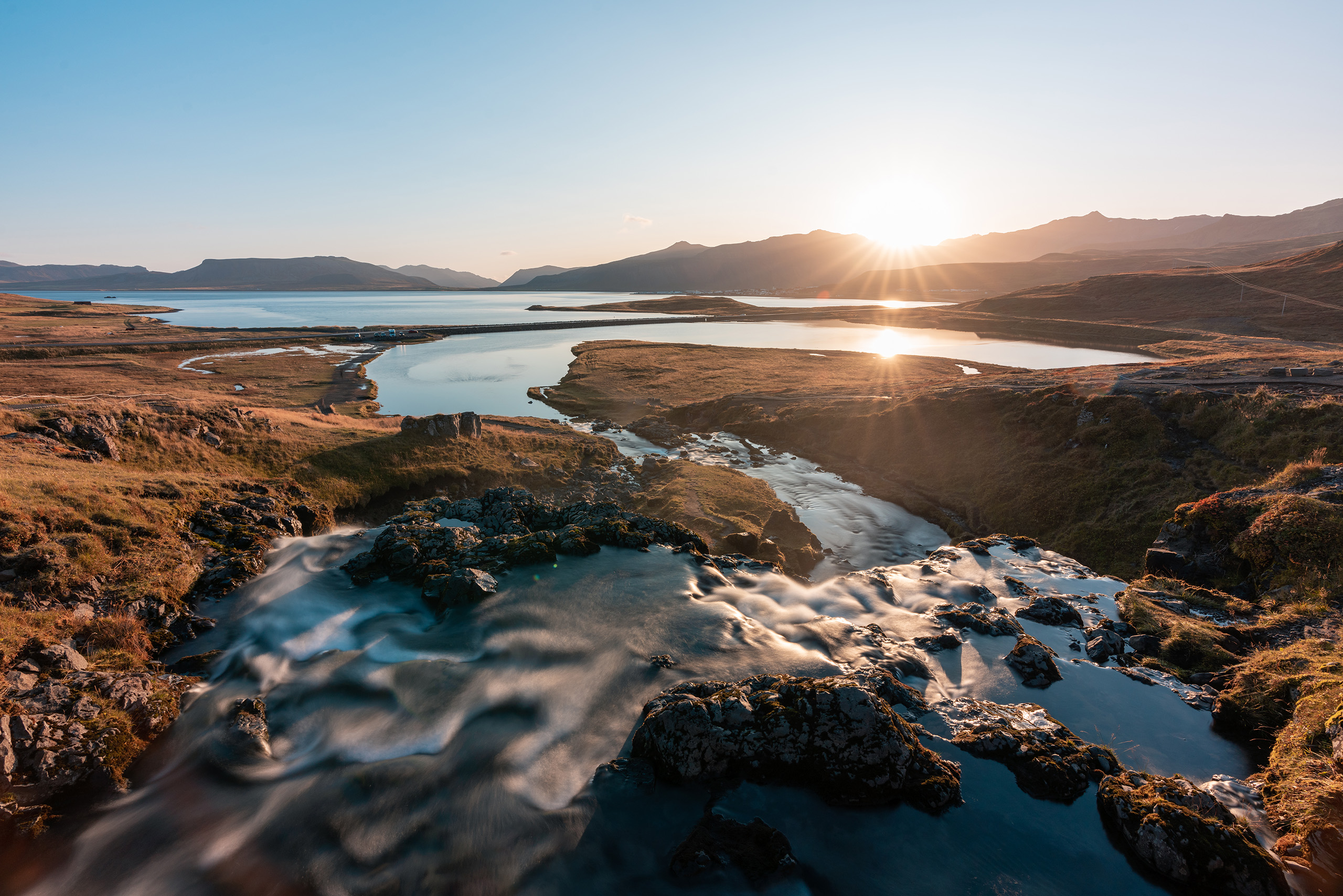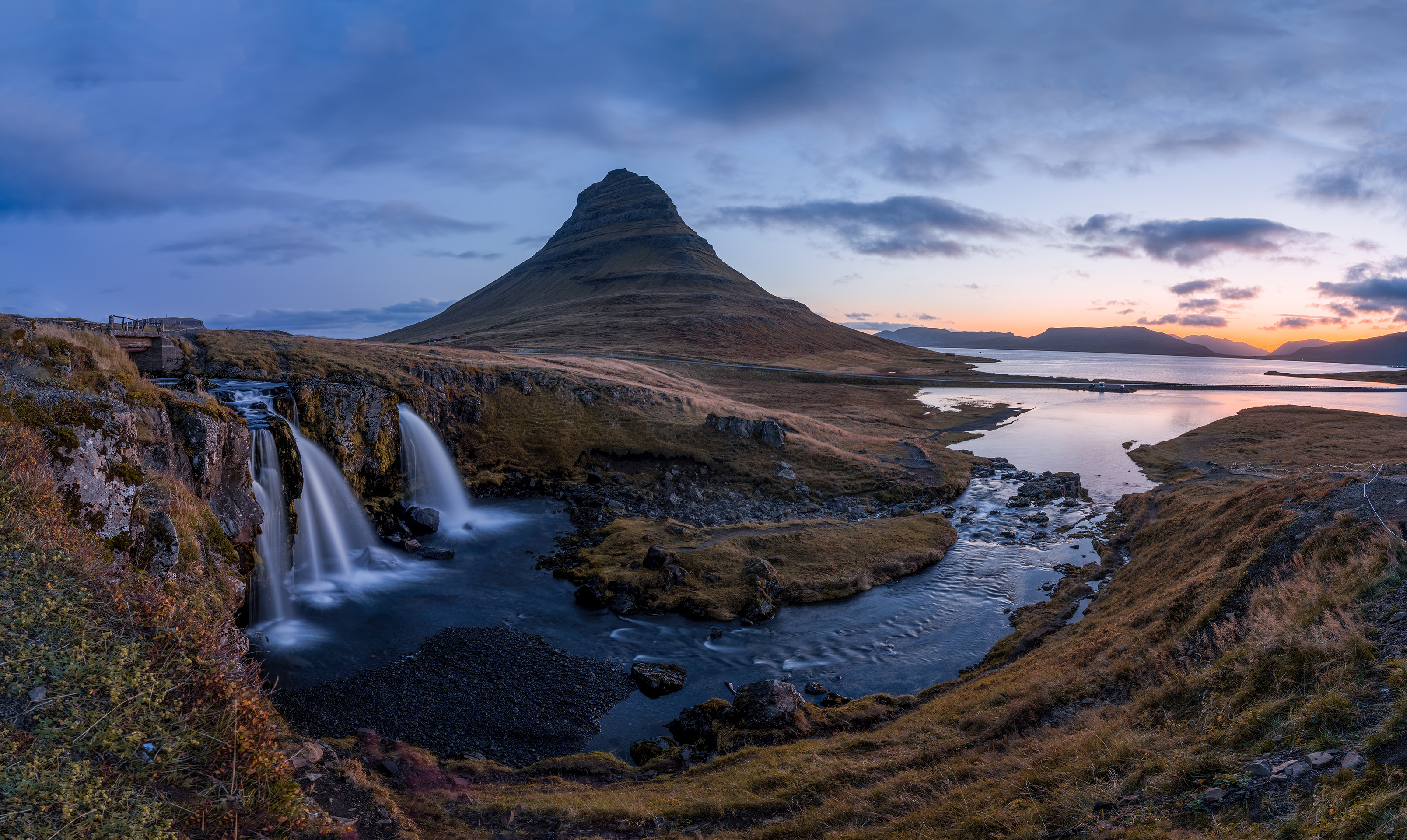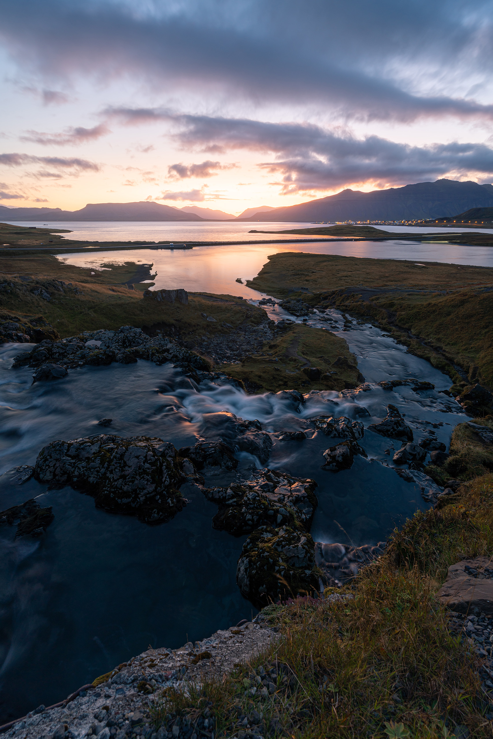 此时还是蓝调时间,草帽山和旁边的格伦达菲厄泽小镇仍然在沉睡,微风吹拂枯草,远处的峡湾海面倒映着渐渐变亮的天空,本该一片宁静,却又被小瀑布打破,水流奔腾着流向大海。我们来到瀑布旁边的景观点,早已有人架着脚架等在那里。
