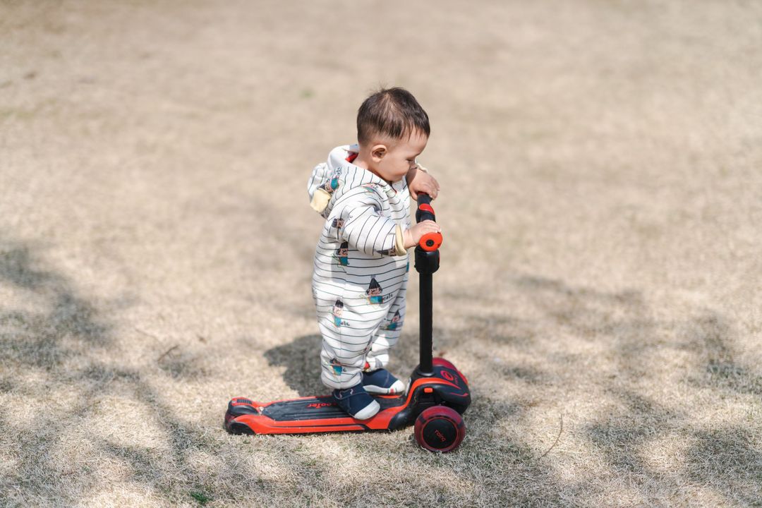 生日礼物我已经提前送给他了,一辆滑板车。他还没到自己滑的年龄,但是每次出去看到别人的总是眼馋,试图爬过去摸轮子。过了两天他就学会了自己抓着把手站在滑板车上让妈妈推着走。