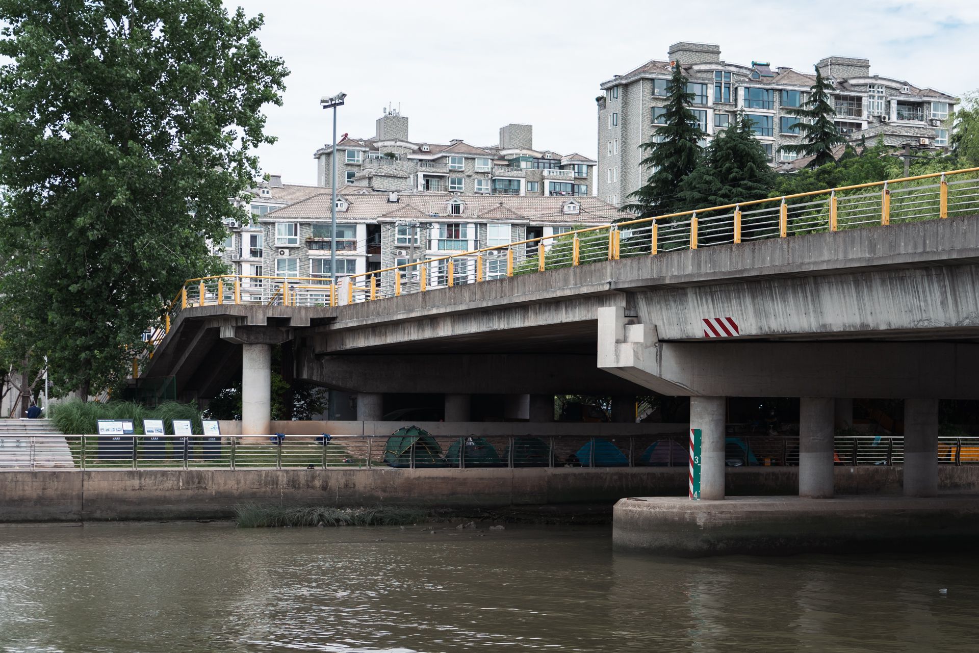 河边桥下搭了很多帐篷,外卖小哥们住在这里,估计是进了小区就再也无法出来,有家不能归还真是讽刺。不过想想他们能跑腿赚的比平时多,也算是一种补偿。