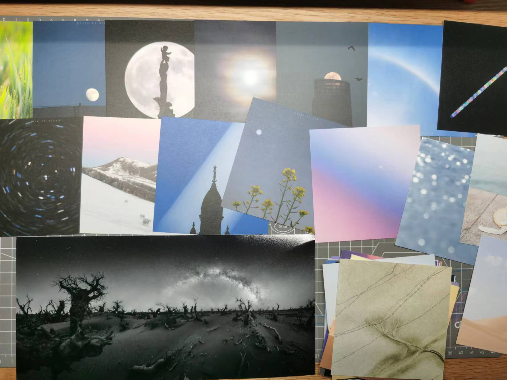 最近他给我寄来了入围的那张作品,是沙漠中一片死去的胡杨林上空的银河拱桥。还有一些卡片,都是简洁的方形照片,我很喜欢。聊了几句,他说我是最开始叫他投夜空中国的人🤣。
