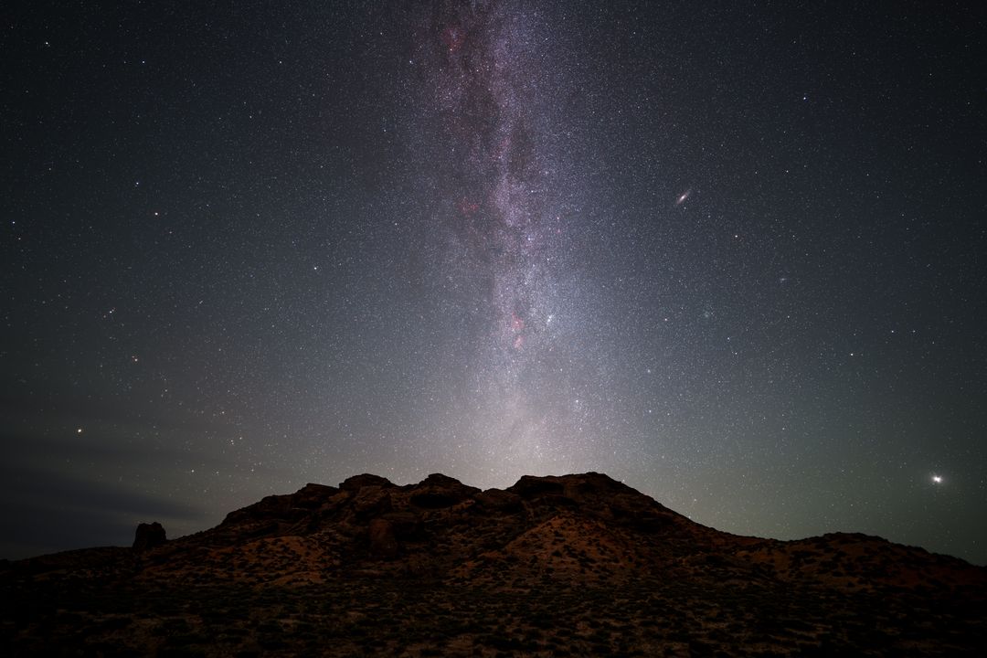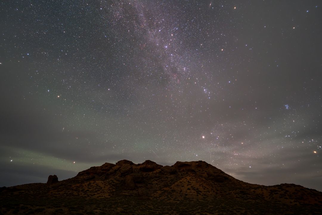 翻过北山,来到土丘跟前。西面和南面城镇的光被北山隔绝,北面则是阿拉善无尽的戈壁沙漠,一公里外的公路偶尔有车路过,再剩下的就是风声和虫鸣。这里是波特尔1级地区,北天银河都清晰可见。