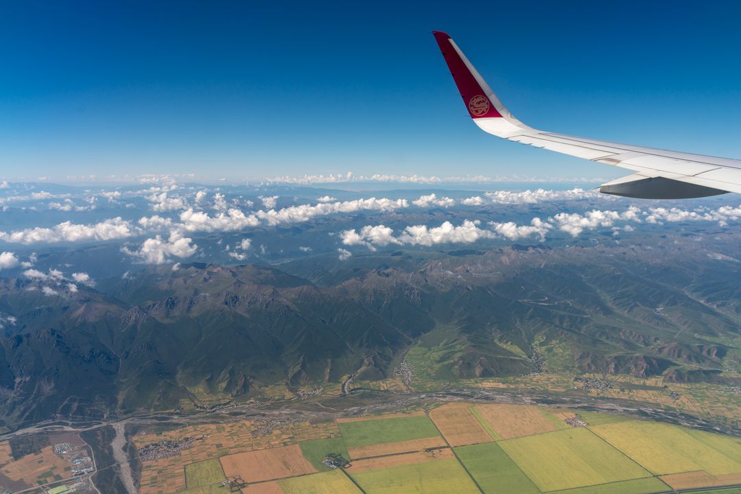 想着能不能在飞机上看到个彩虹什么的,选了靠左边靠窗的座位。一路上云是蛮多的,但并没有彩虹,后面的熊孩子还一直踢靠背到兰州才下去。拜他所赐,我也没机会补觉。好在景色相当不错,充满白雾的山谷、蜿蜒曲折的河流、山顶上飘着一朵小云。特别是从兰州起飞之后的一段,裸露的灰色岩石山体、山下的草甸和农田,是一个相当富饶的地区,完全不像兰州的黄土。后来小羽跟我说这是甘南地区,加入心愿单。