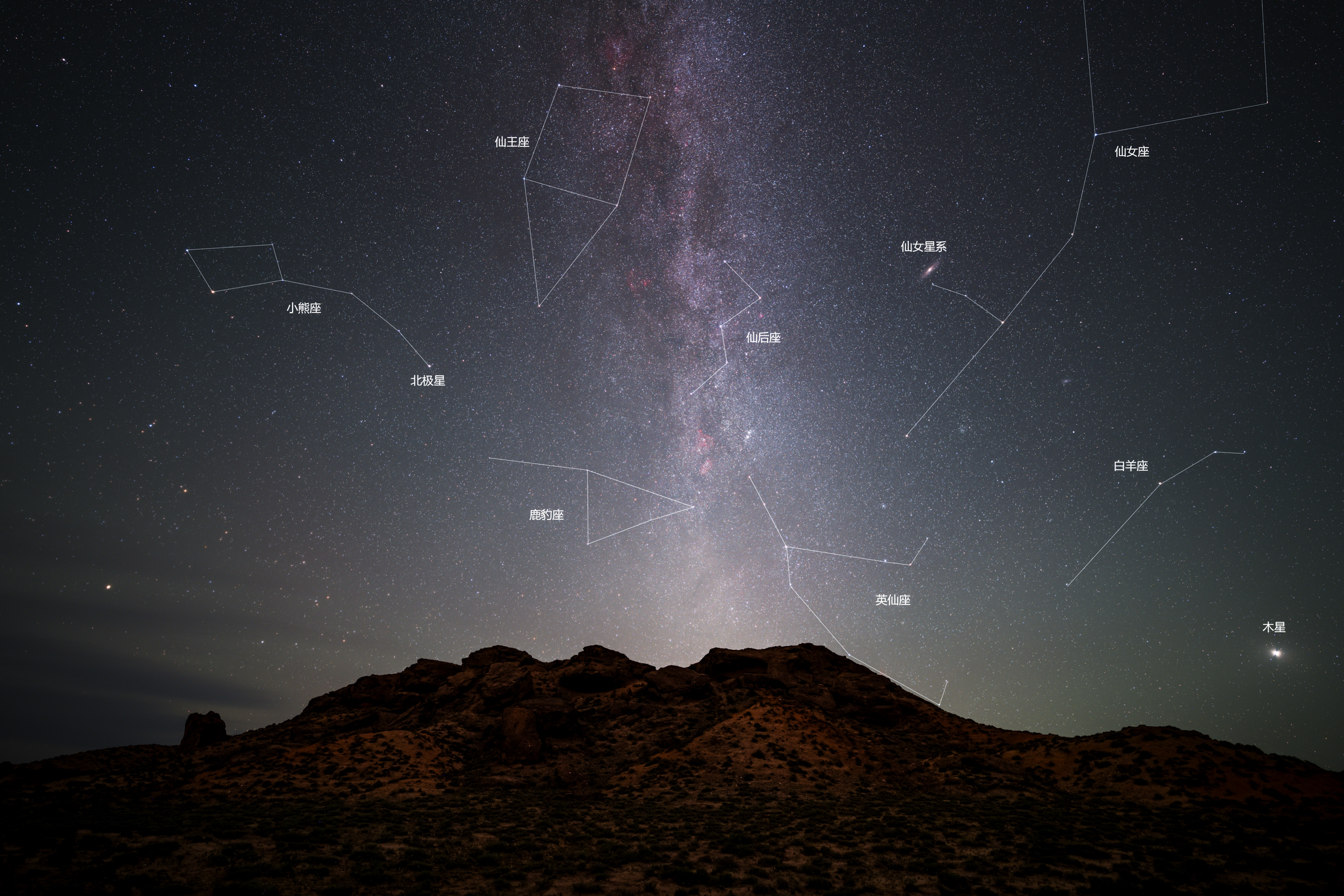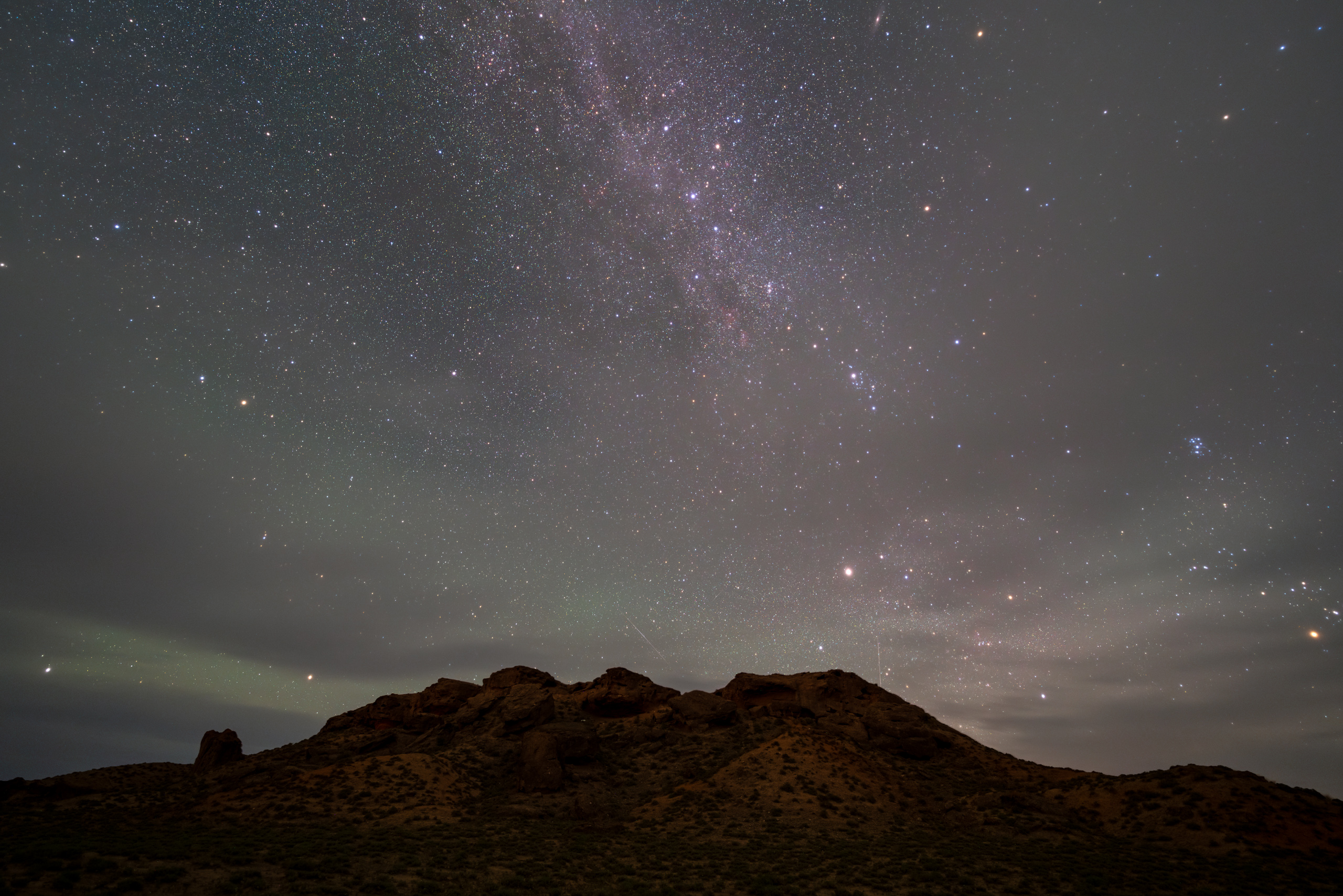 翻过北山,来到土丘跟前。西面和南面城镇的光被北山隔绝,北面则是阿拉善无尽的戈壁沙漠,一公里外的公路偶尔有车路过,再剩下的就是风声和虫鸣。这里是波特尔1级地区,北天银河都清晰可见。