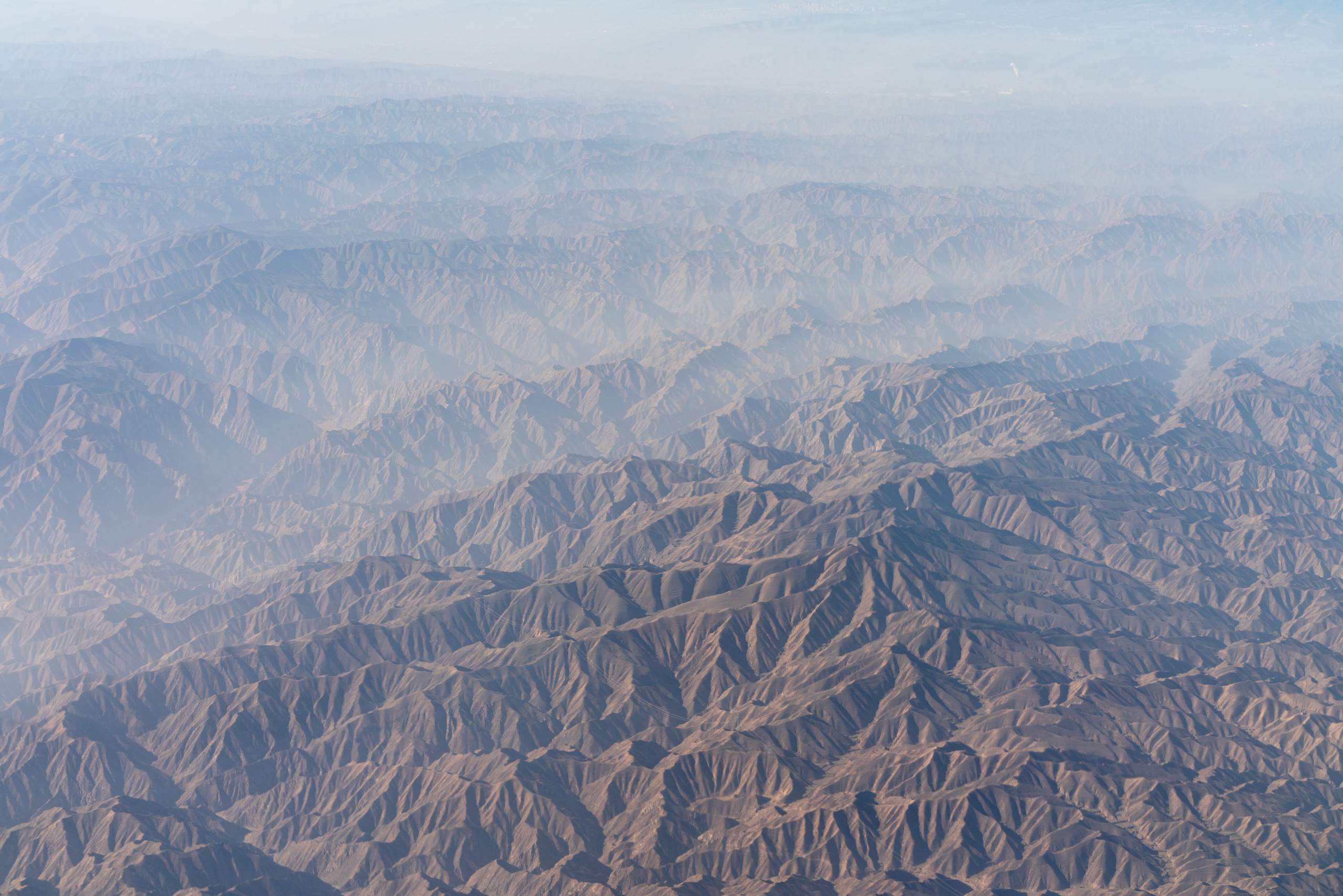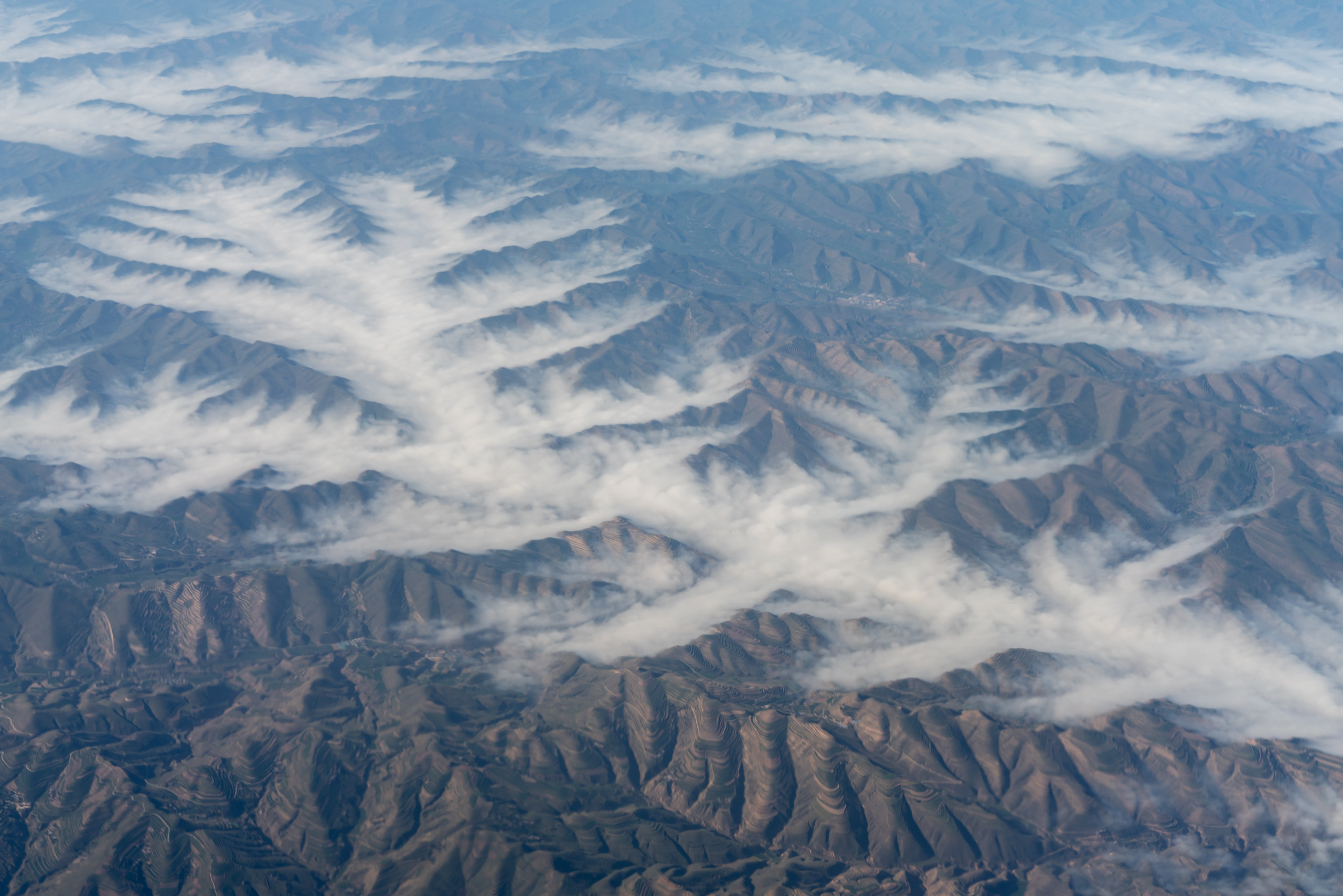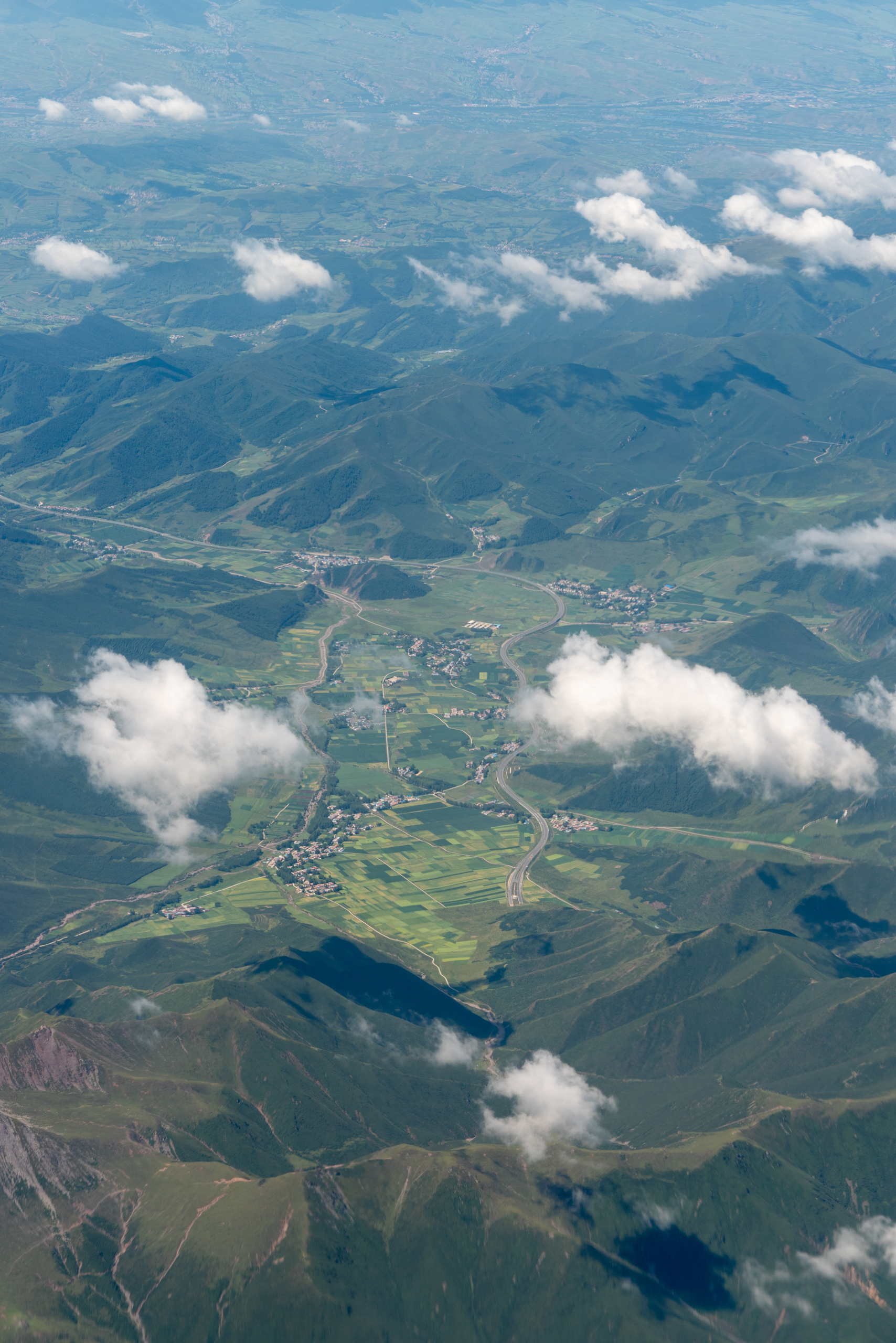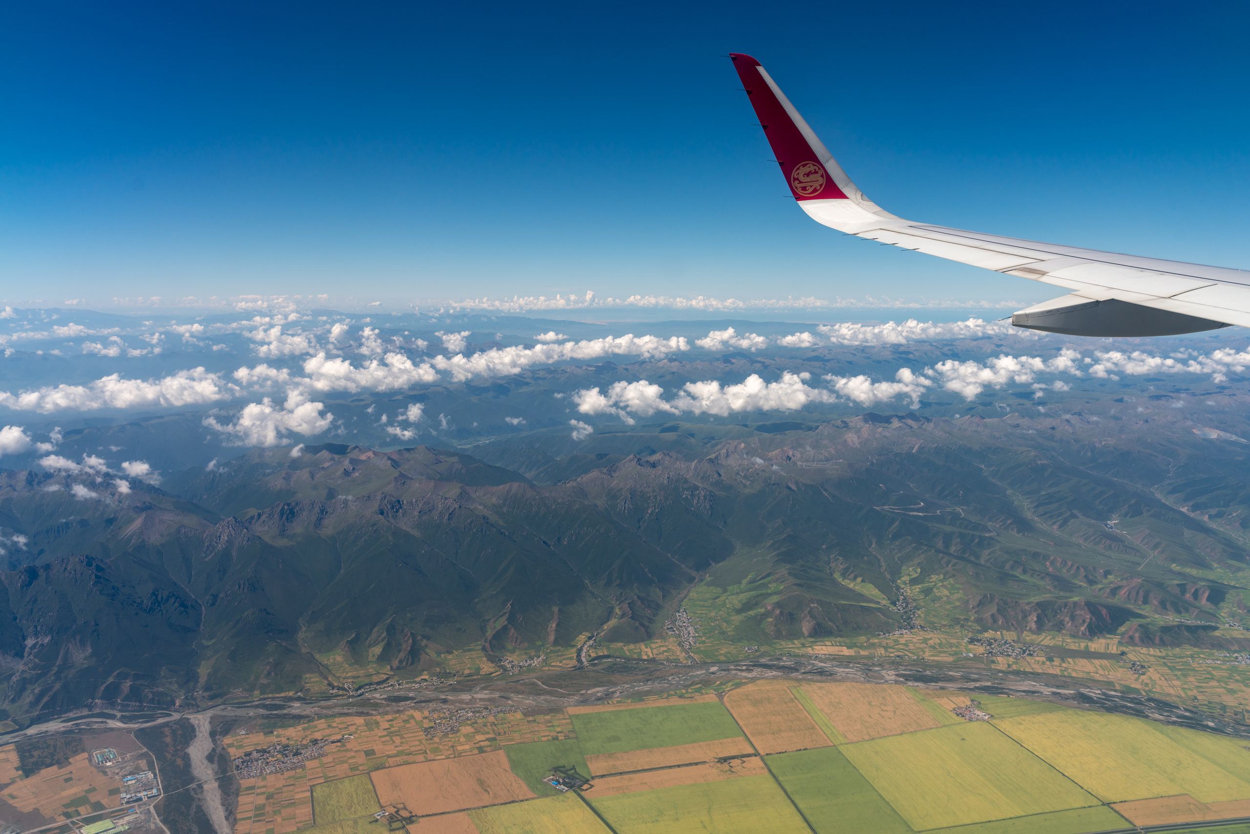 想着能不能在飞机上看到个彩虹什么的,选了靠左边靠窗的座位。一路上云是蛮多的,但并没有彩虹,后面的熊孩子还一直踢靠背到兰州才下去。拜他所赐,我也没机会补觉。好在景色相当不错,充满白雾的山谷、蜿蜒曲折的河流、山顶上飘着一朵小云。特别是从兰州起飞之后的一段,裸露的灰色岩石山体、山下的草甸和农田,是一个相当富饶的地区,完全不像兰州的黄土。后来小羽跟我说这是甘南地区,加入心愿单。