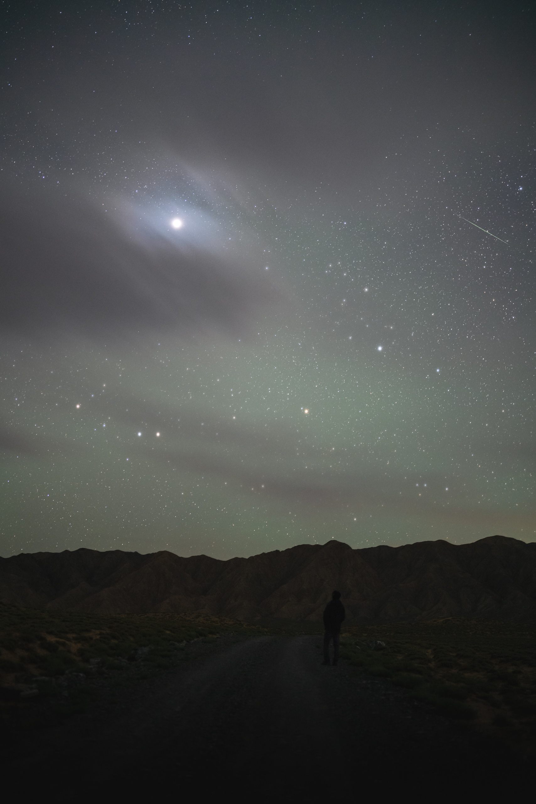 张掖在河西走廊中间,南北都是山,南面是祁连,北面的山我不知道名字,当地人叫北山,翻过去是阿拉善右旗。英仙座位于东北方向,半夜升起,决定先去北山脚下看看。小羽说当地城镇化时很多墓都被迁到了北山脚下,这并不是一个看流星雨的好地方。我原以为只有一小片,结果还离得很远就看到了戈壁上有些小小的建筑,看不清是什么,并不像是村落,懂的都懂。这下完全避不开了,还是去找别的地方吧。