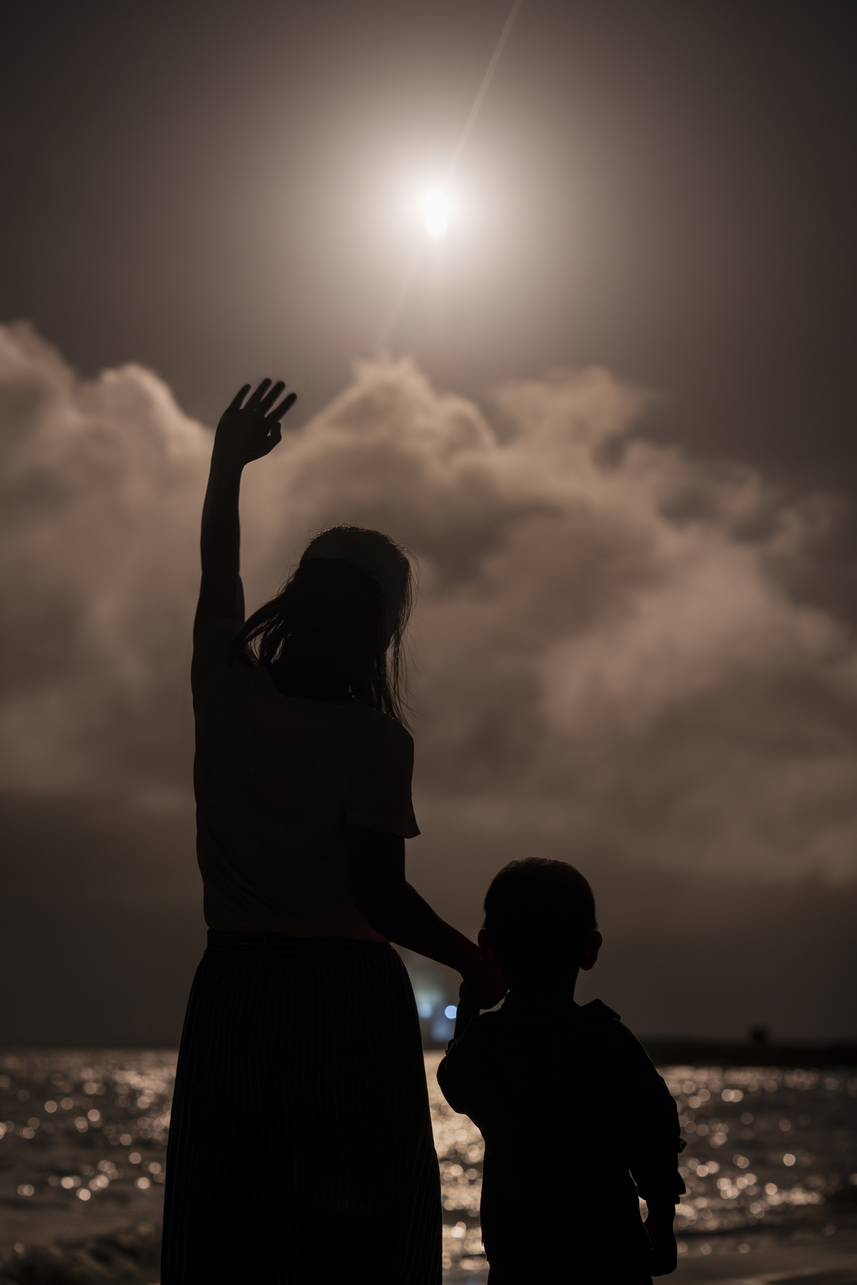 穿过人群,来到海边,小万万还是躲着海浪,晚上在海边玩似乎让他又有点紧张。我把头灯递给他,他正好挂在胸前帮我们照路😂。找了个人稍少的地方,小羽和小万万坐下来挖沙子、吃零食,消磨时间。我一边寻找构图,一边高强度刷着微博,一边关注塔架的情况。