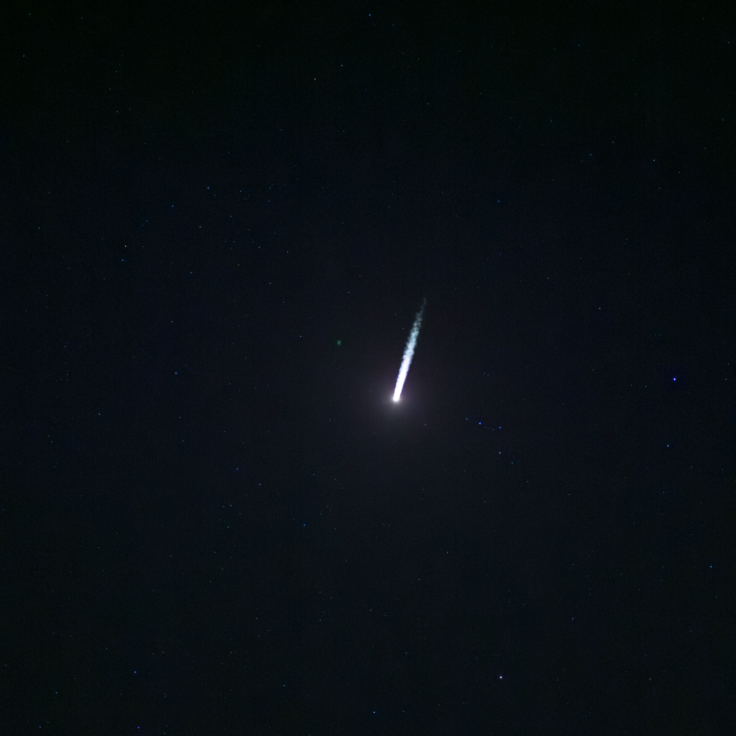 火箭越升越高,助推器分离,一级分离,此时它的尾焰越来越黯淡,然后熄灭(稀薄空气中的燃烧是很难看见的)。