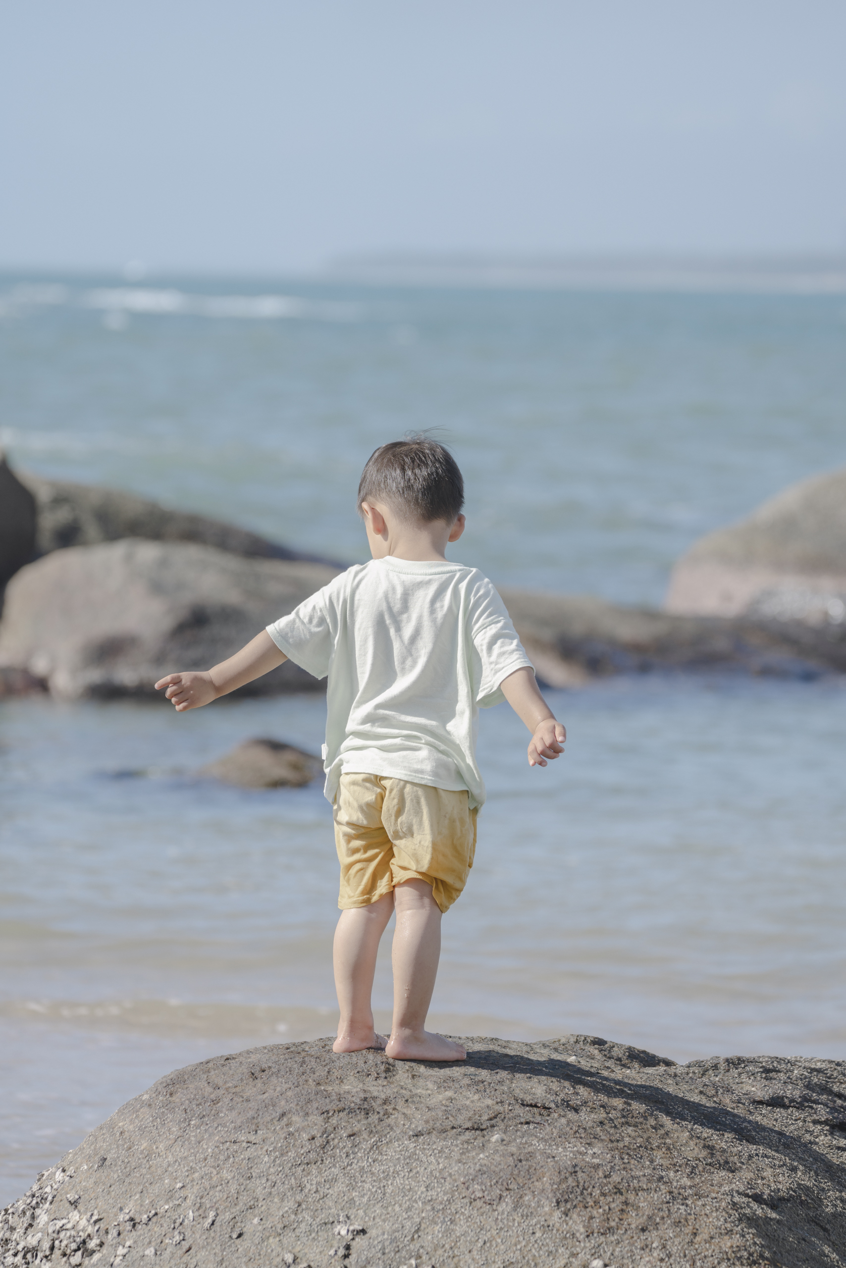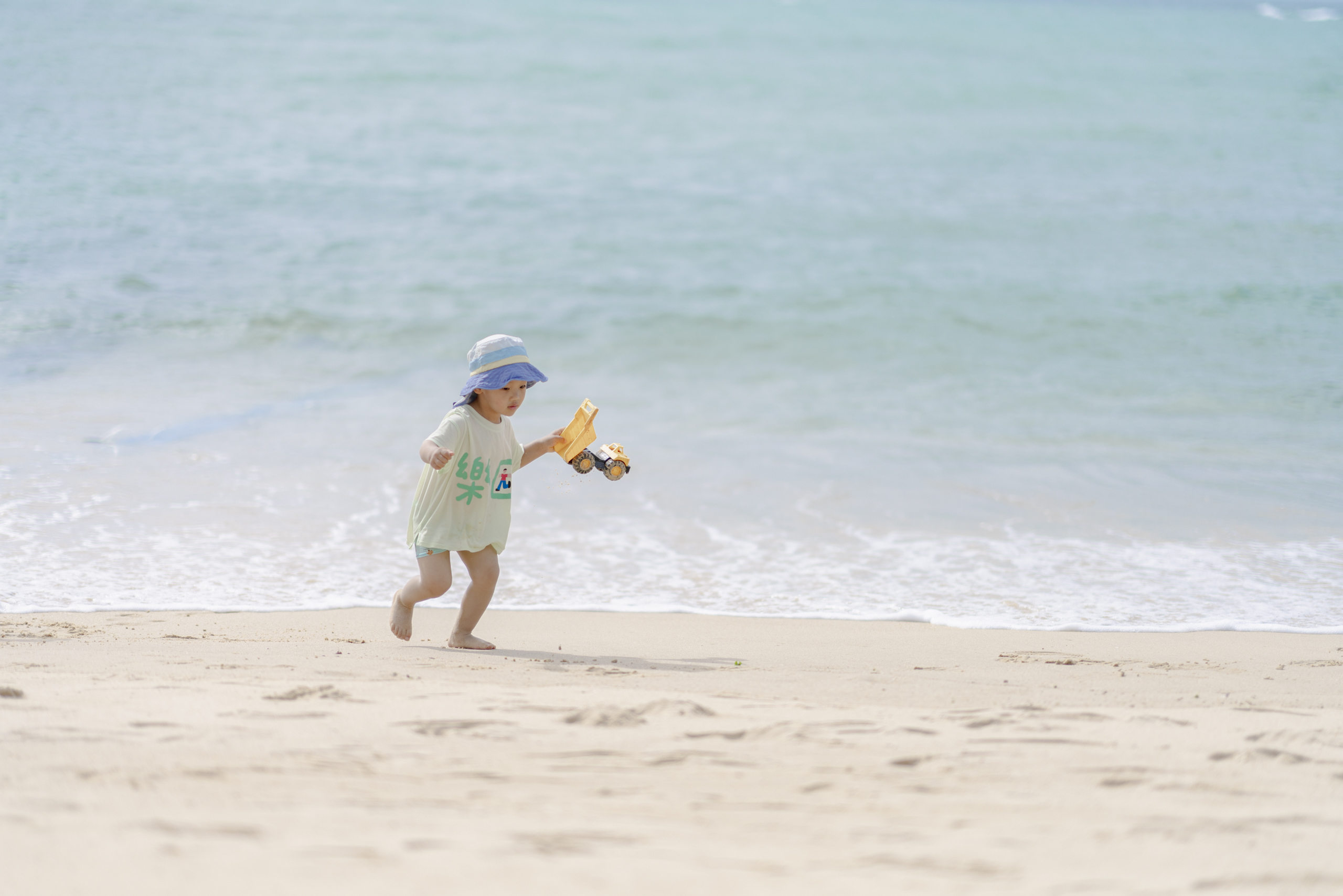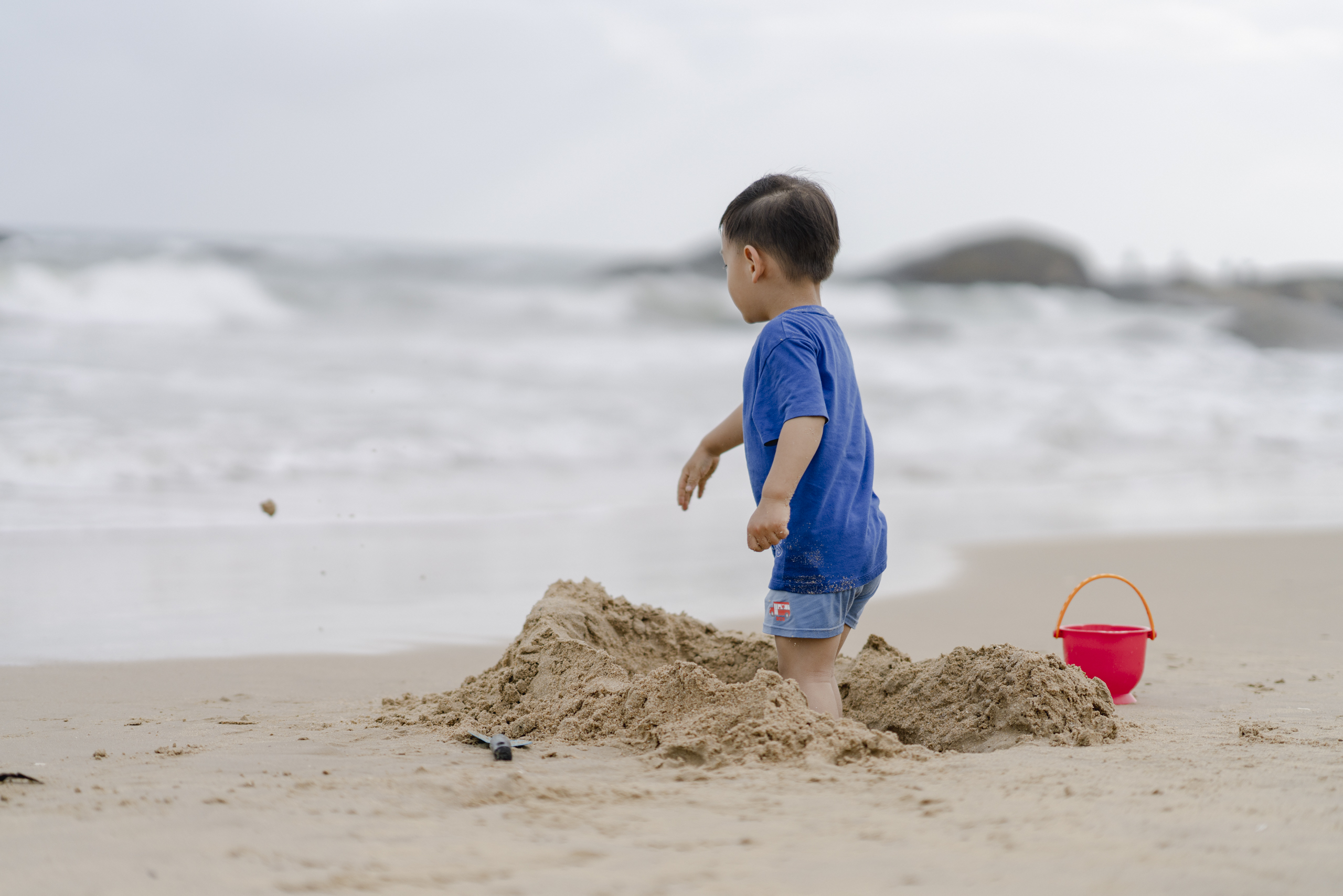 带小万万走过沙滩,他很兴奋,开始挖坑。我拉着他来到海边,想让他感受一下海水冲到脚上,结果海浪的轰鸣声把他吓哭了,之后就再也不肯接近水了。他就是这样一个敏感的孩子,看着旁边一个比他小的小妹妹跟父母踩水踩得不亦乐乎,他也无动于衷,还是远离海水,自己挖坑。小羽用小水桶提水,让他过去拿,海浪一冲过来他就跑😂。