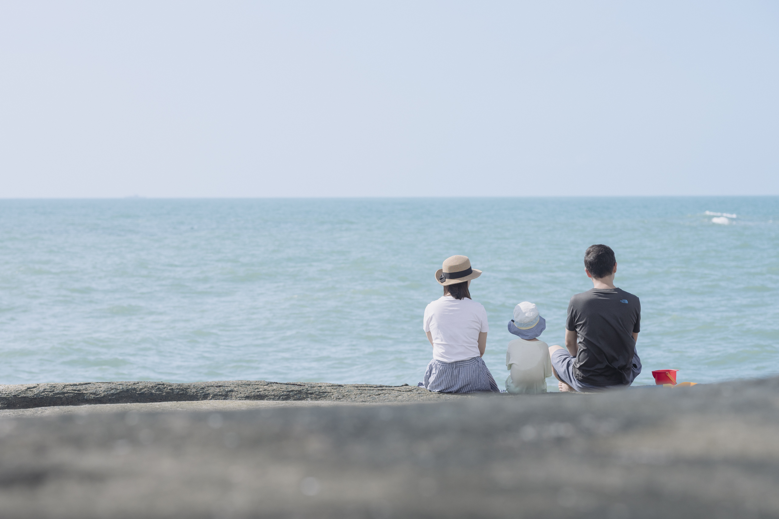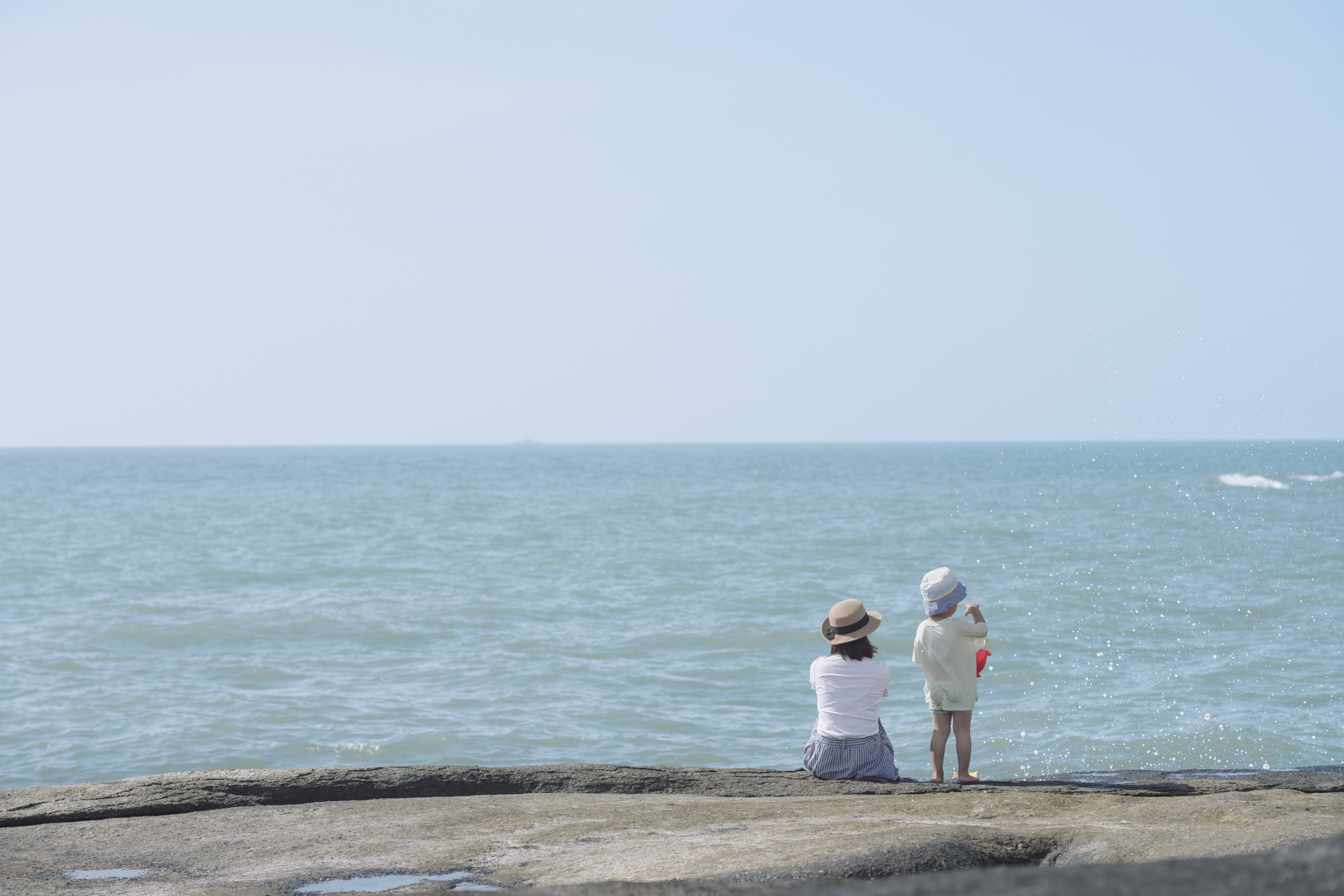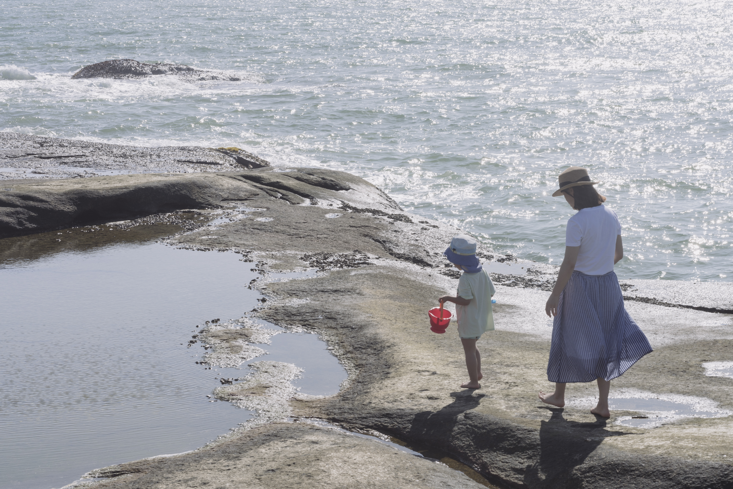 海边有几块巨大的礁石,隔离出了一些浅滩,水流缓慢,退潮时可以从浅滩爬到石头上。没了海水的冲击力和轰鸣声,小万万再也不紧张了。挖坑、捡贝壳、追螃蟹、抓小鱼。我们爬上大石头,上面有大大小小的潮池,里面也有些小鱼,游得飞快,小万万拿着小桶在水里推来推去试图抓住它们。