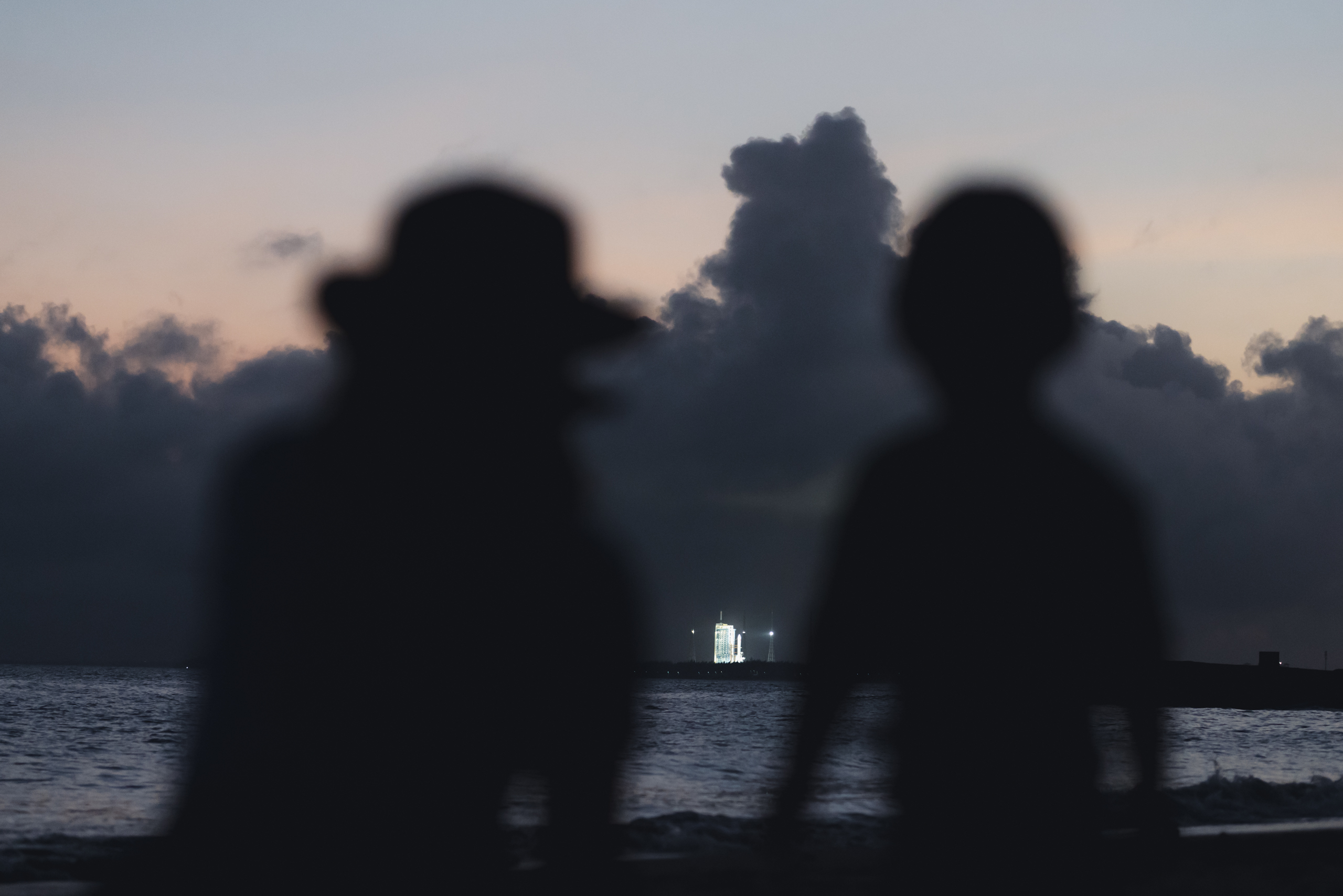 旅行社组织的内场观礼可以近距离感受火箭的尺寸和巨大的轰鸣,最为震撼;龙楼镇中心的酒店、民宿的楼顶不近不远,是拍火箭摄尾焰的最佳机位;铜鼓岭居高临下,有着极好的视野,旁边的居民楼区高层甚至可以躺着看发射。但我还是独爱海滩,不认识的人聚在一起,一起倒计时、一起欢呼、一起聆听、一起仰望星辰大海,氛围很好。另外,如果要以50mm或者85mm的视角拍摄火箭发射的环境人像的话,这个距离很适合。