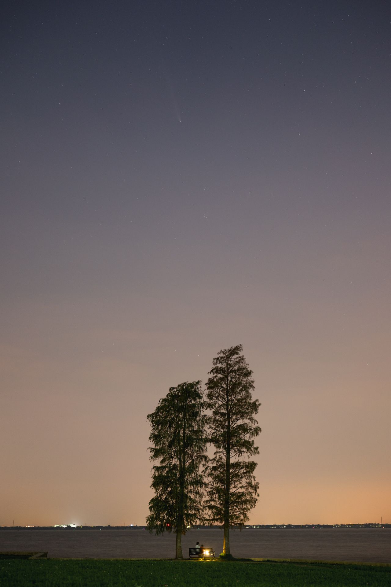 到了十月下旬,这颗彗星逐渐变暗,肉眼已经看不到了。我不想放弃,在一个傍晚驱车来到了淀山湖畔,最后只拍到了它的影子。