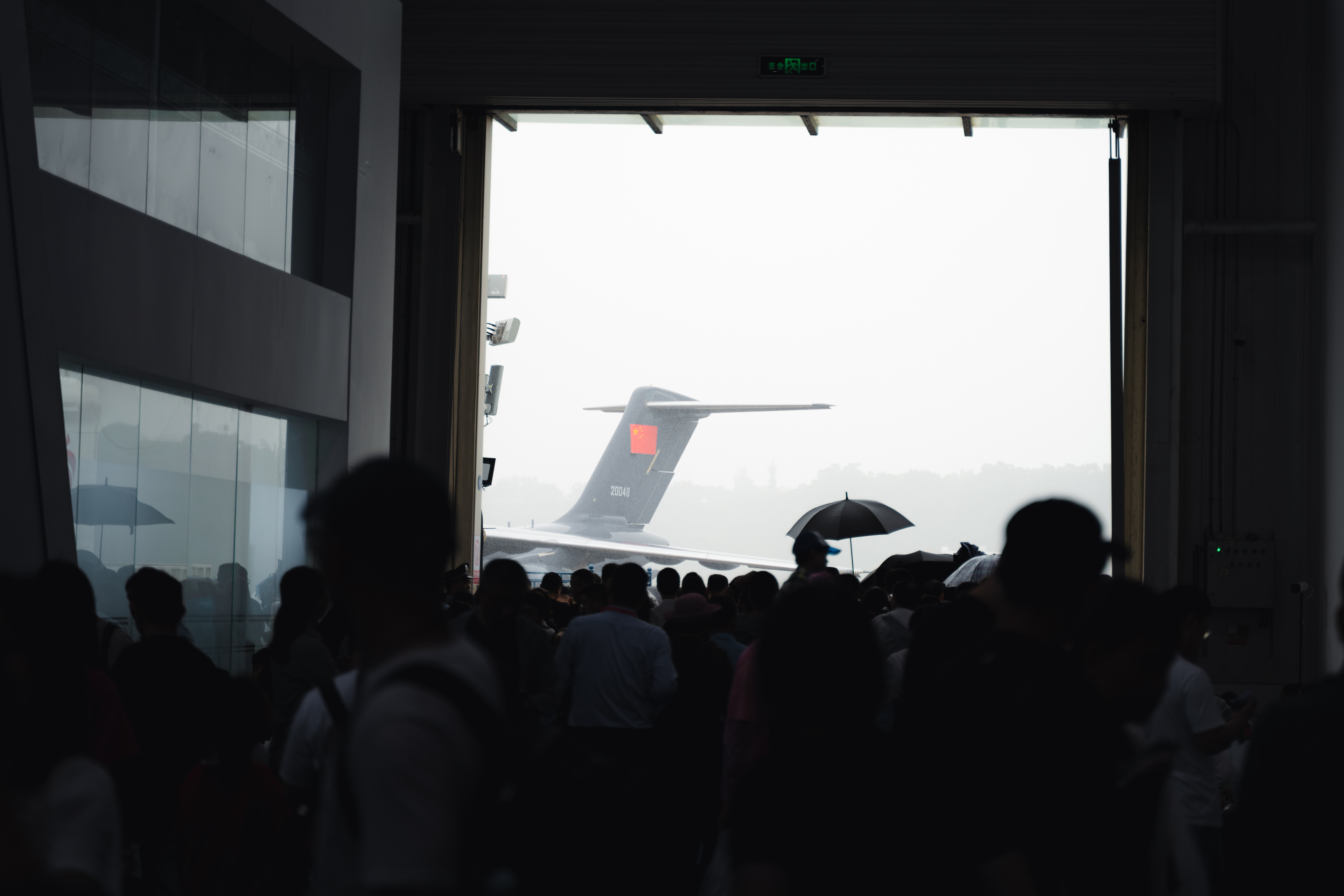 不过还是有几张照片让我印象深刻。早上,我刚带他进入一号馆,外面天灰蒙蒙的下着大雨。我们逛了一圈来到了走道里,猛然发现场馆外的运-20的尾翼,让我有些震撼。尾翼上的五星红旗在阴天里尤为显眼。