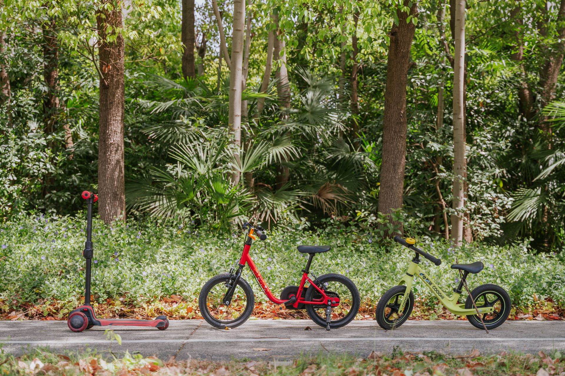 小万万原来的坐骑是一辆红色的14寸迪卡侬自行车。最近春暖花开,带着他去了环迪斯尼绿道骑车,一碰到有岔路短暂分离然后再交会就咯咯咯的笑。还有一次在明镜荡断断续续骑了10公里。这两小车已经渐渐不堪重负,身高马上要超过上限了,踏频飞快速度却很慢,于是有了换车的想法。