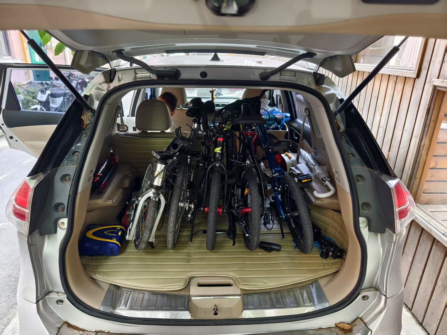 最最重要的是,它折起来很小,我的后备箱里放倒一个座椅就能同时装下我们的三辆车,善哉。