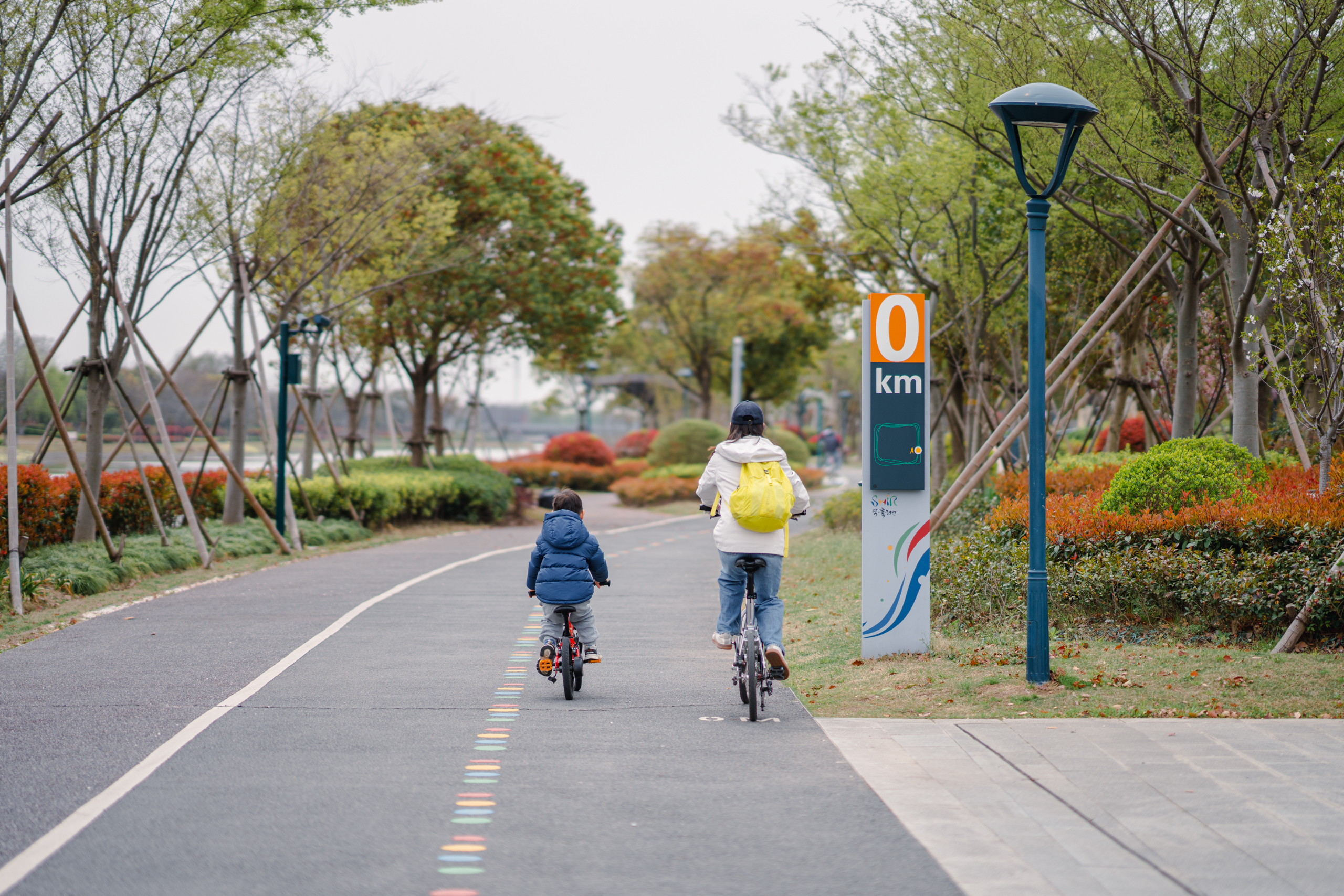 自从小万万拆掉了辅助轮,骑车技术逐渐长进,天天在河边绿道上飞驰。见他已经能够遵守靠右行驶的规则,不再蛇皮走位,我们开始带他去专门的骑行道骑车。