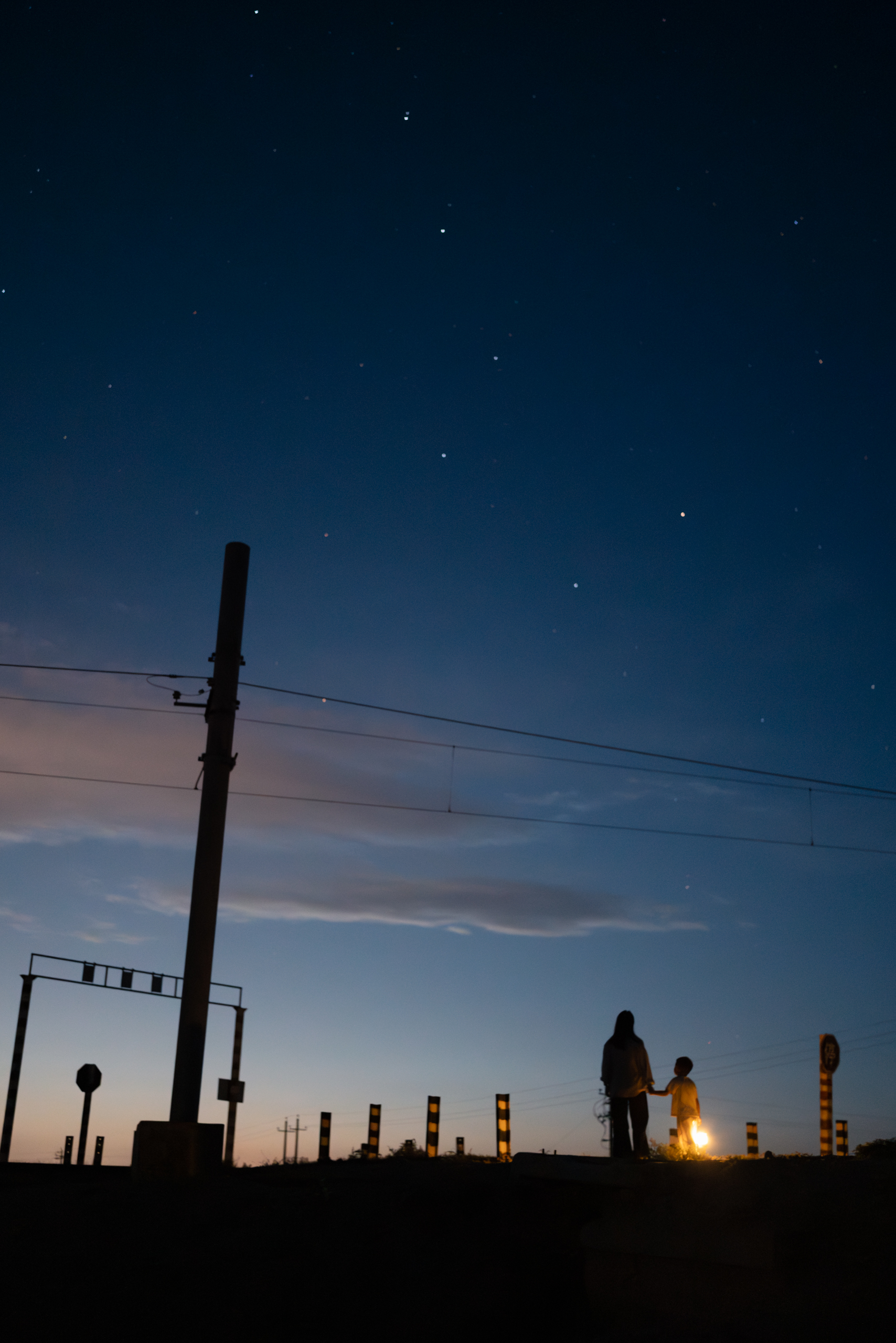 傍晚,云彩退去,天气转晴,吃完饭,果然还是想拍点人与星空,放弃了去大峡谷,带他们来到了山羊堡的单线铁路。远方机场的灯光很亮,不过依然能看到漫天繁星。